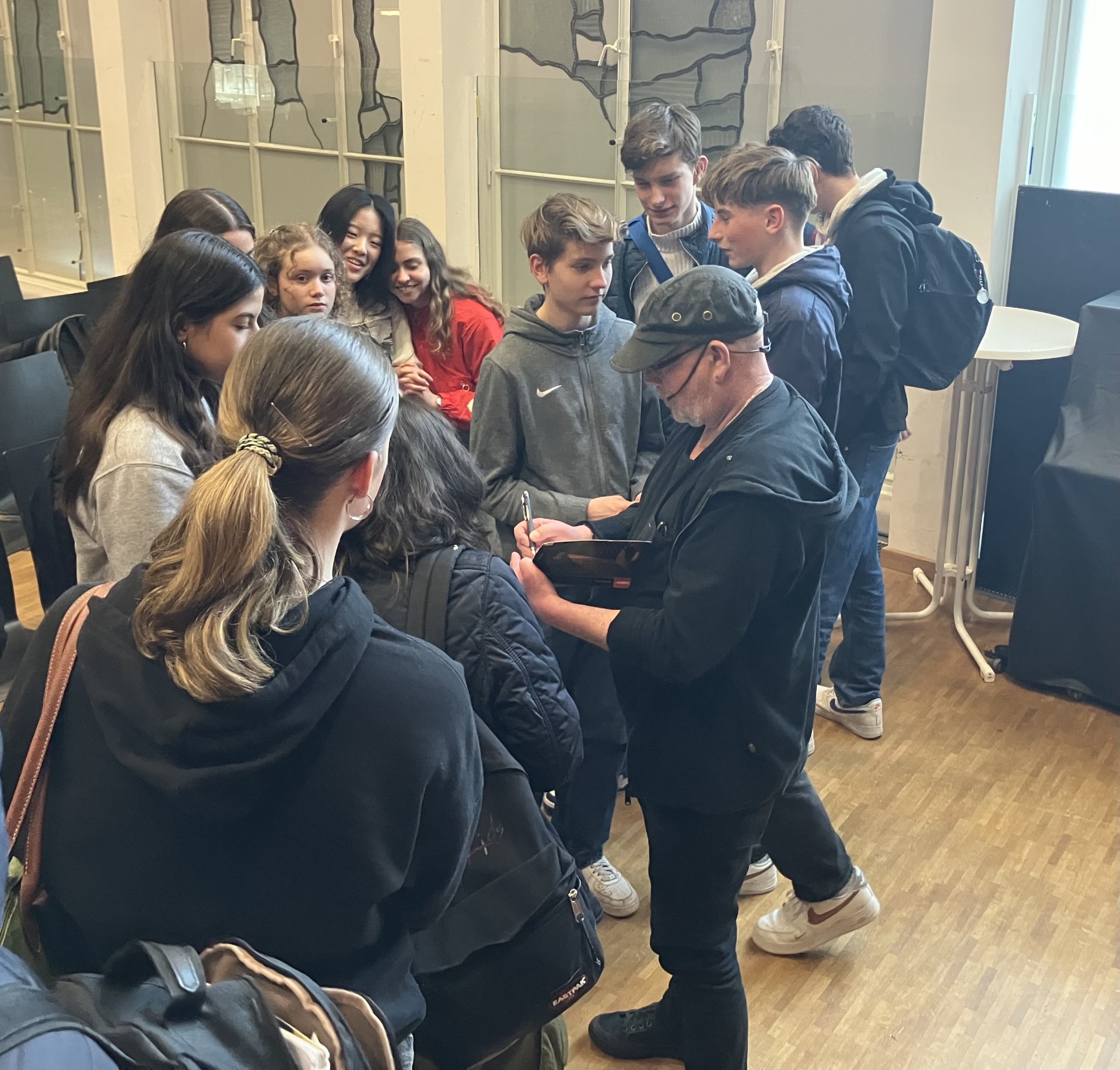 Als wir nach dem offiziellen Ende der Lesung als Klasse noch einmal die Möglichkeit bekamen, ihm persönlich Fragen zu stellen, antwortete er sehr viel offener und ausführlicher als zuvor, woran man merkte, dass er persönliche Gespräche bevorzugte. Wir erfuhren, dass er vor seiner Tätigkeit als Autor schon viele künstlerische Berufe ausprobiert hatte, aber seine Liebe zum Schreiben schon immer am stärksten gewesen war. Außerdem sei er durch seine Beobachtungen von anderen Menschen und der Umwelt sehr inspiriert, wobei seine Ideen für Geschichten aber aus seinem Inneren und seinen Erfahrungen entstehen würden. Durch seine gut nachvollziehbaren Antworten wirkte er auf uns sehr authentisch.