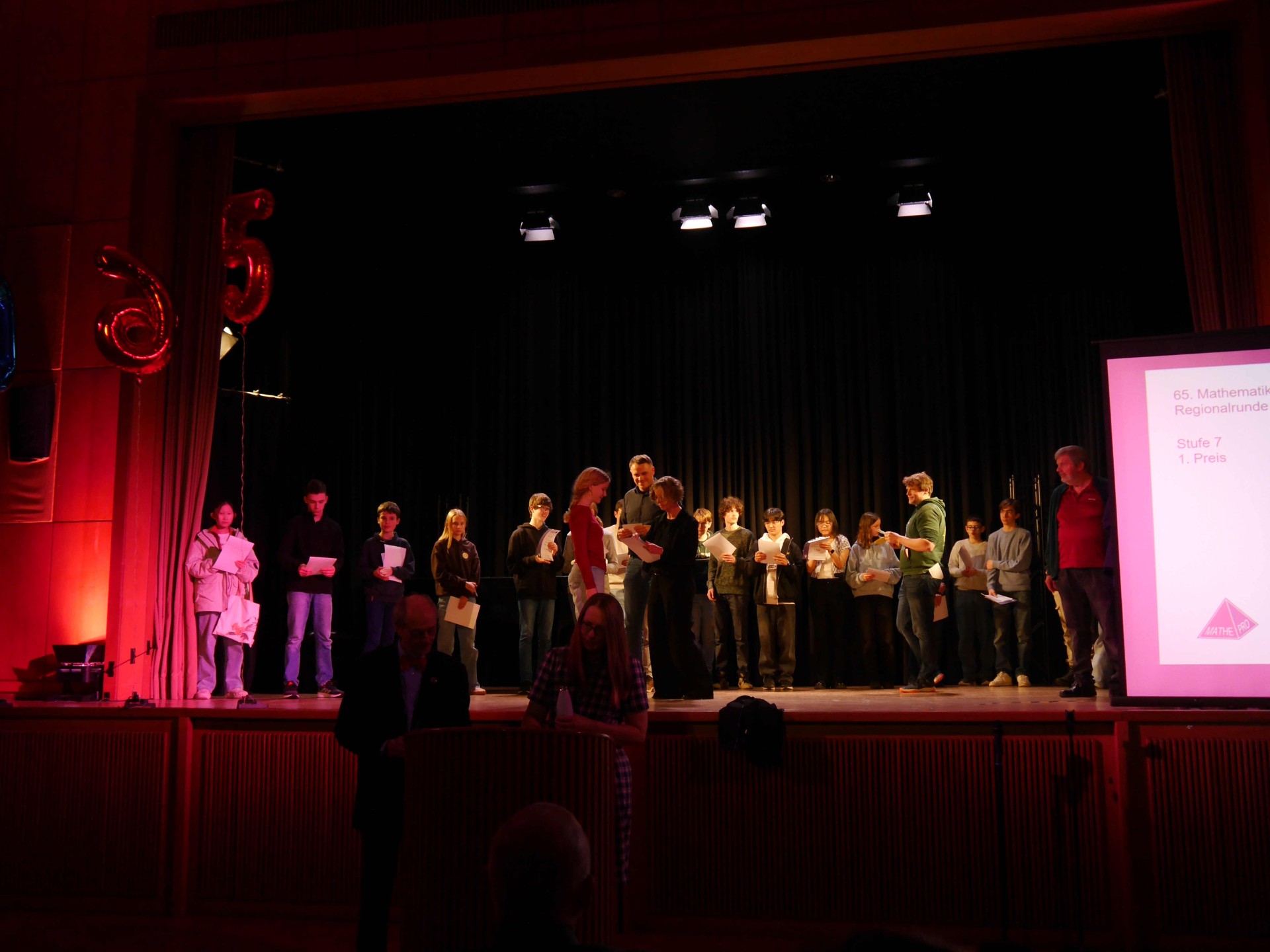 Die Siegerehrung zur Regionalrunde fand am Donnerstag, den 27.11.2025 in unserer BG-Aula statt. Es gab an diesem Abend einen mathematischen Festvortrag von Prof. Dr. Witthaut vom Forschungszentrum Jülich, der mit dem „Braess-Paradoxon“ in sehr anschaulicher Weise eine Anwendung der Spieltheorie in der Verkehrsplanung präsentierte. Darüber hinaus gab es ein feines Musikprogramm mit BG-Beteiligung durch Laurenz Schleifenbaum am Klavier.