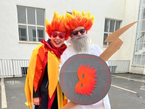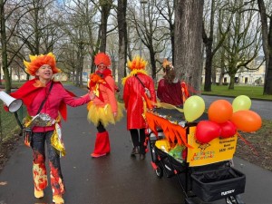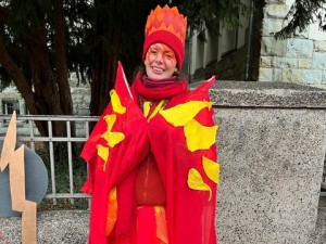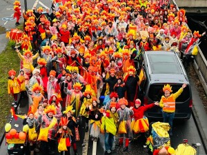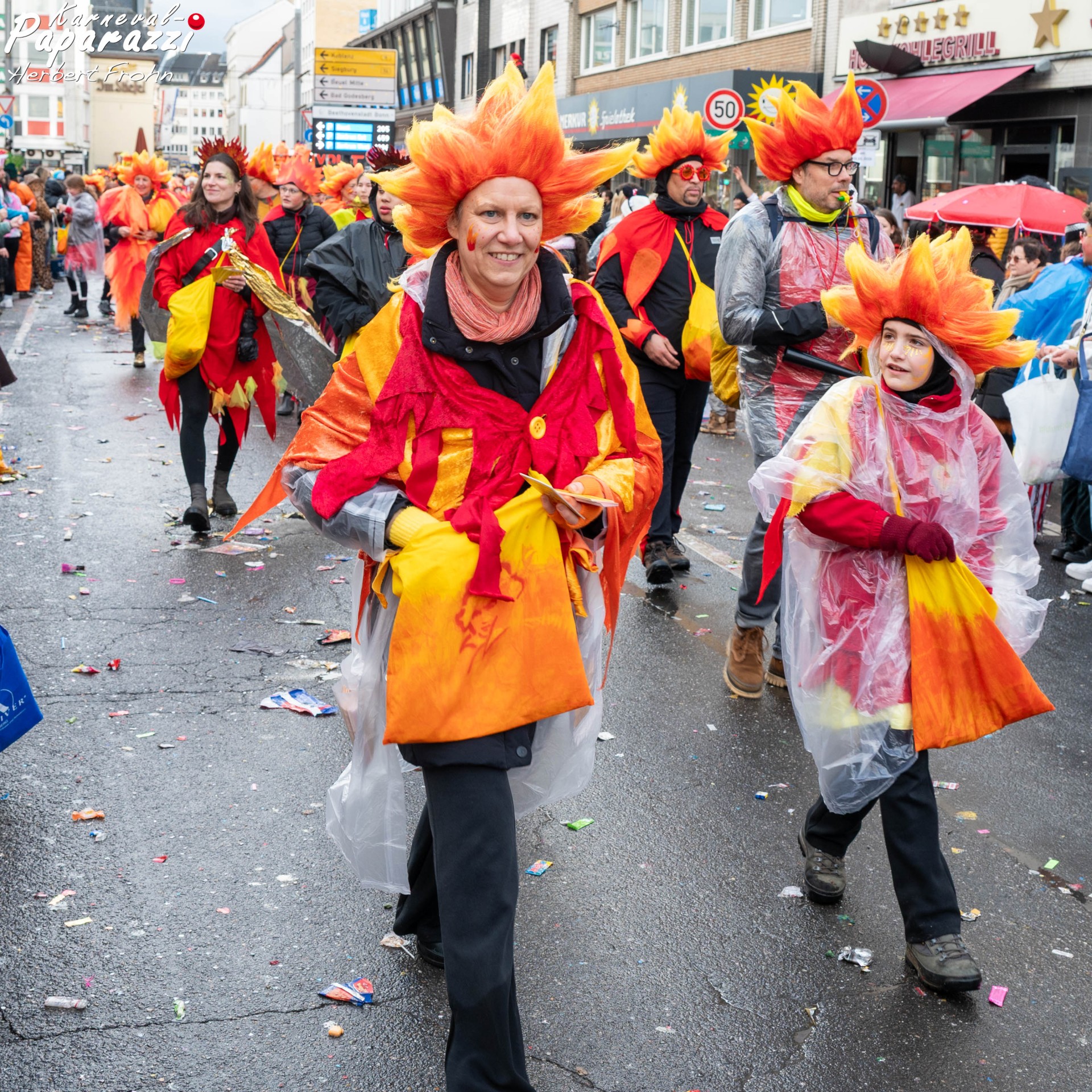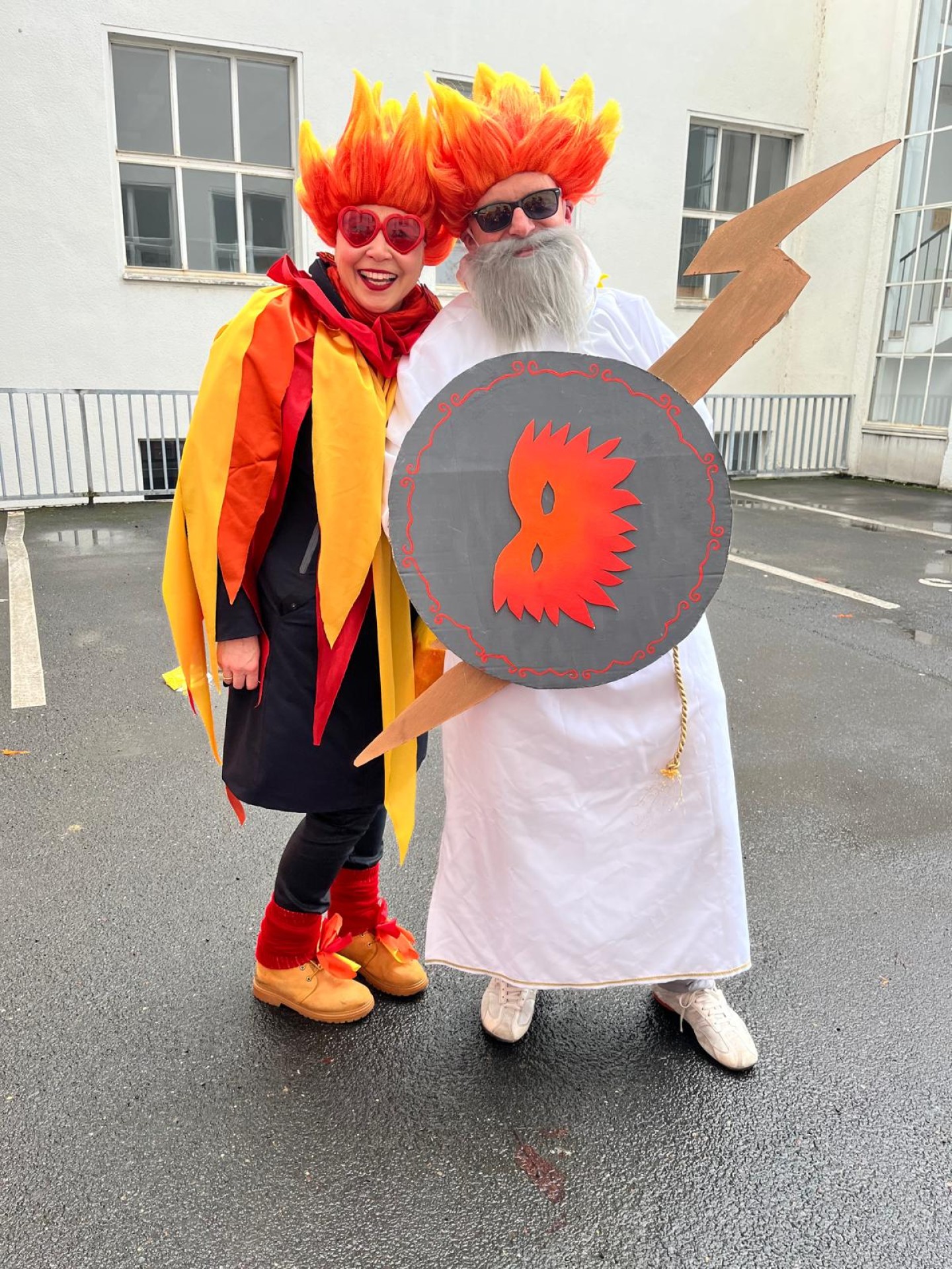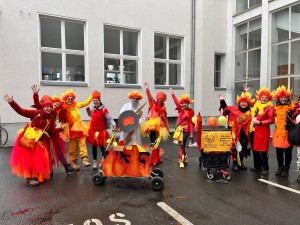 Unsere Kunstlehrerin Ella Brauer erstellte das Kostümkonzept, bot Workshops an und stand kreativen Ideen und praktischen Tipps zur Seite. Wochenlang wurden Umhänge und Röcke genäht, Kopfbedeckungen gestaltet, Kamellebüggel gebatikt und gebügelt – alles in knalligem Gelb, Orange und Rot, damit die Funken auch von Weitem strahlen. Und das taten sie!
